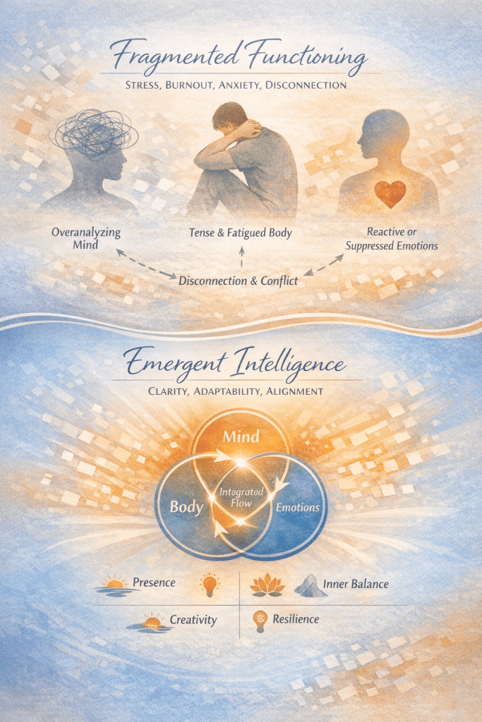 By contrast, when the physical, mental, and emotional systems communicate fluidly through an integrated analysis–reaction loop, they generate what can be described as emergent intelligence—a synergistic capacity of iterative adaptation leading to outcomes exceeding the sum of its parts. In this state, perception becomes clearer, responses become more adaptive, and behaviors align more naturally with intention and values. Rather than reacting from fear, habit, or overload, individuals can choose to respond with presence, discernment, creativity, and resilience .